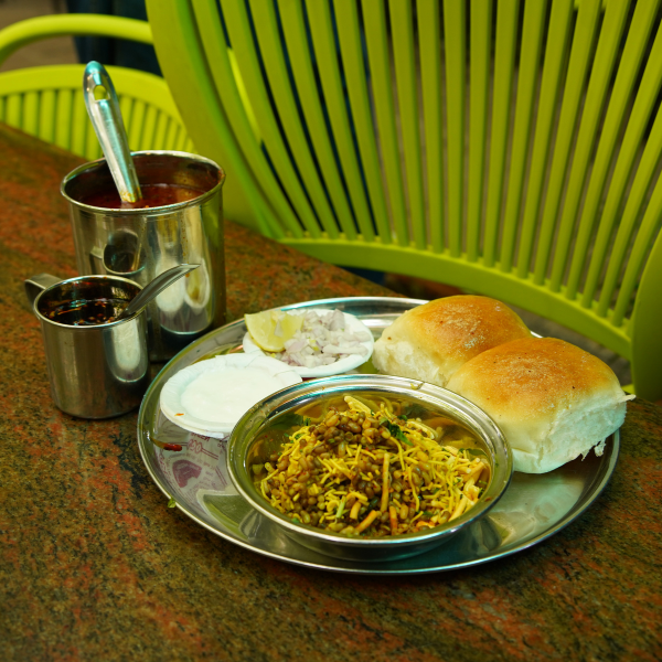 Authentic Nashik-style spicy Misal with matki, rassa, crunchy shev, onion, lemon, and soft pav.