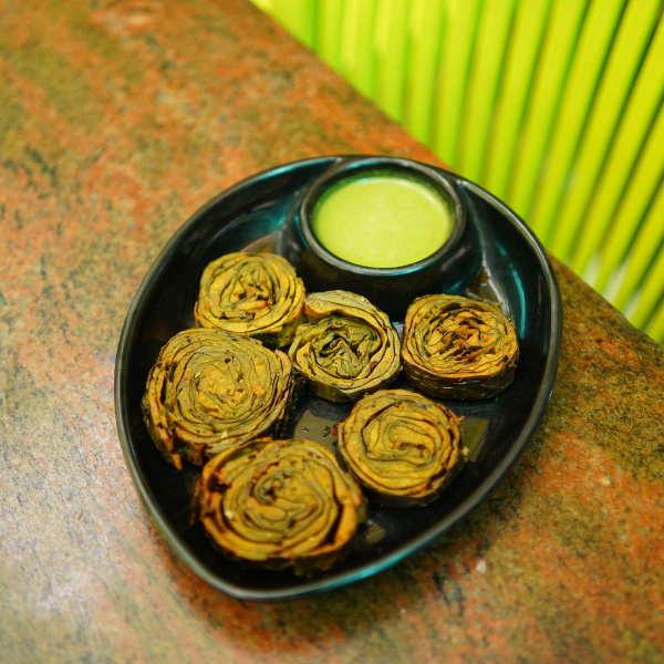 Traditional aluvadi with spiced colocasia leaves, steamed and seasoned.