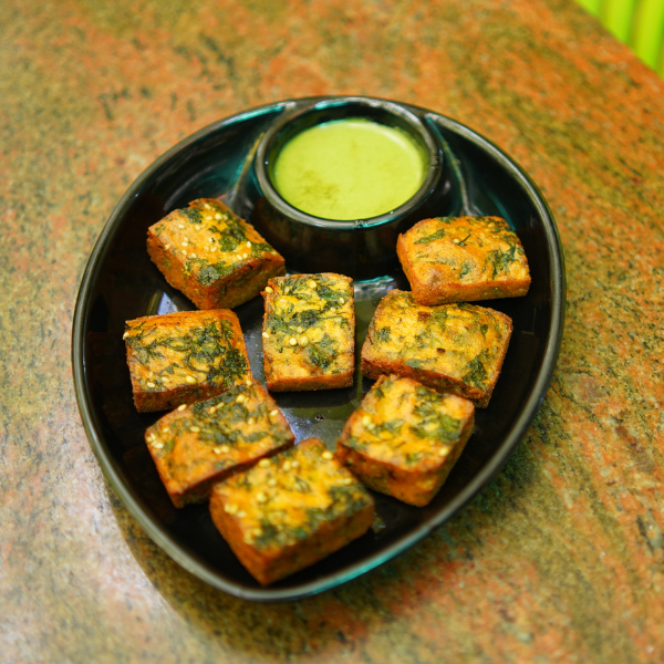 Soft, steamed dhokla with light spices and mild sweetness.